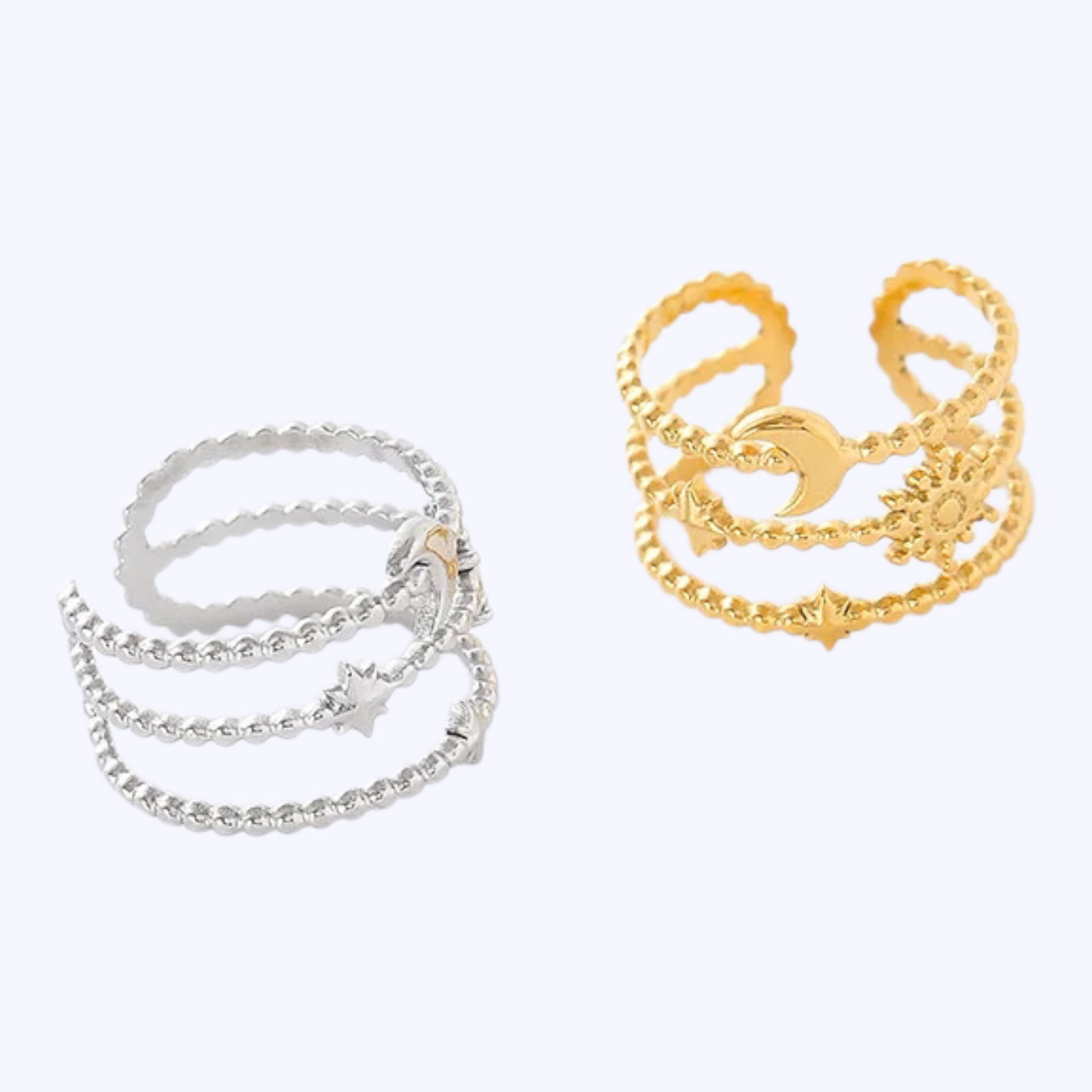 Anello tripla fedina che cattura l'essenza cosmica in una forma raffinata e contemporanea. Tre bande fini creano un effetto visivo sofisticato, perfetto per chi ricerca eleganza senza compromessi. Il design minimalista si sposa con dettagli galattici che riflettono la firma stilistica di Galexia Gioielli, distinguendosi dai trend del momento con un'identità autentica. Versatile e affascinante, si adatta a ogni occasione, dal quotidiano agli eventi speciali. Un pezzo che unisce semplicità estetica e profondità simbolica, ideale per chi apprezza gioielli con carattere e significato.