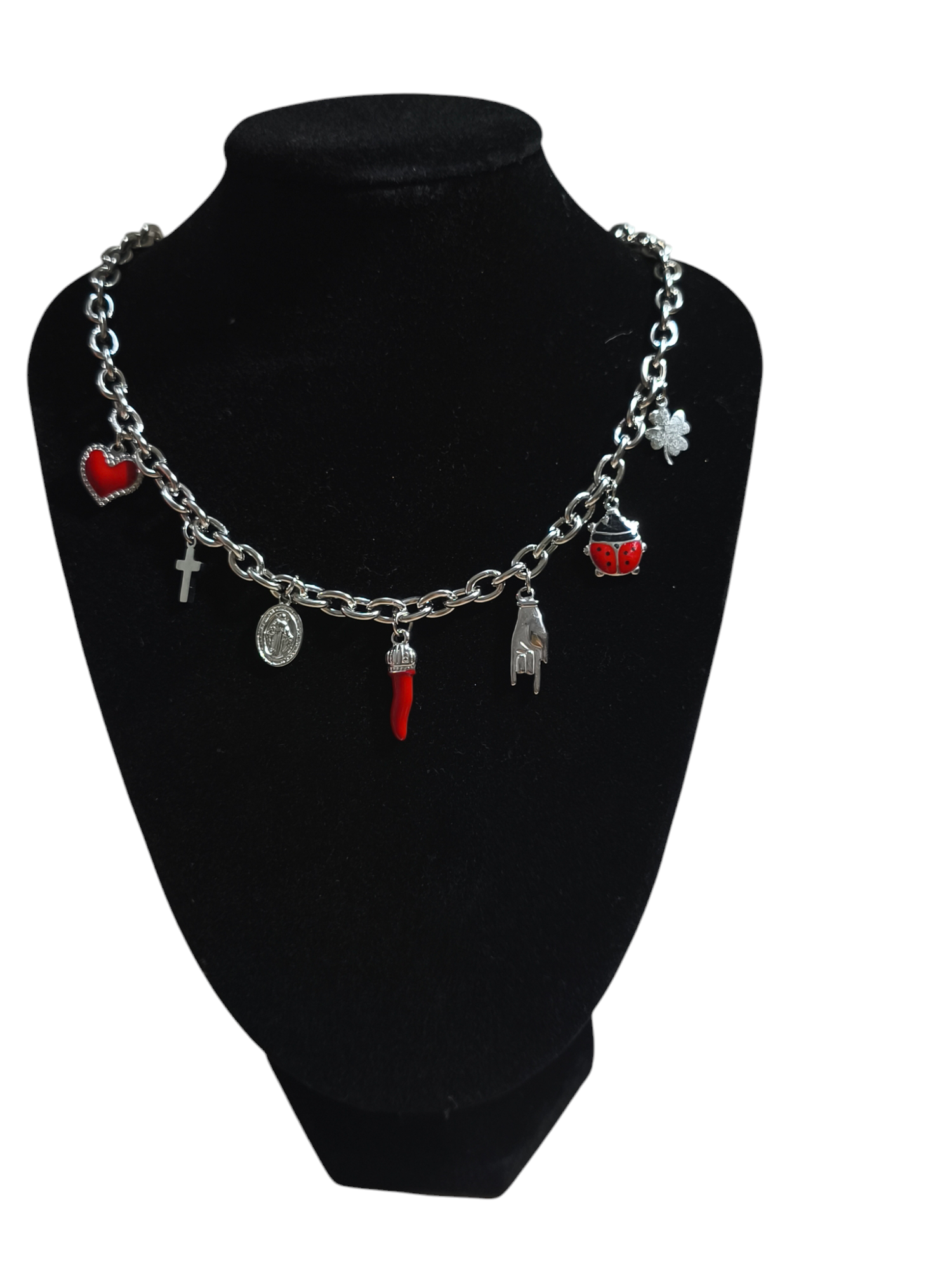 Porta fortuna e protezione sempre con te con la nostra collana con ciondoli simboli di buon auspicio. Carina, moderna e alla moda, i charm sono l'accessorio del momento. Aggiungi un pizzico di fortuna e allegria al tuo look con questa collana unica.
