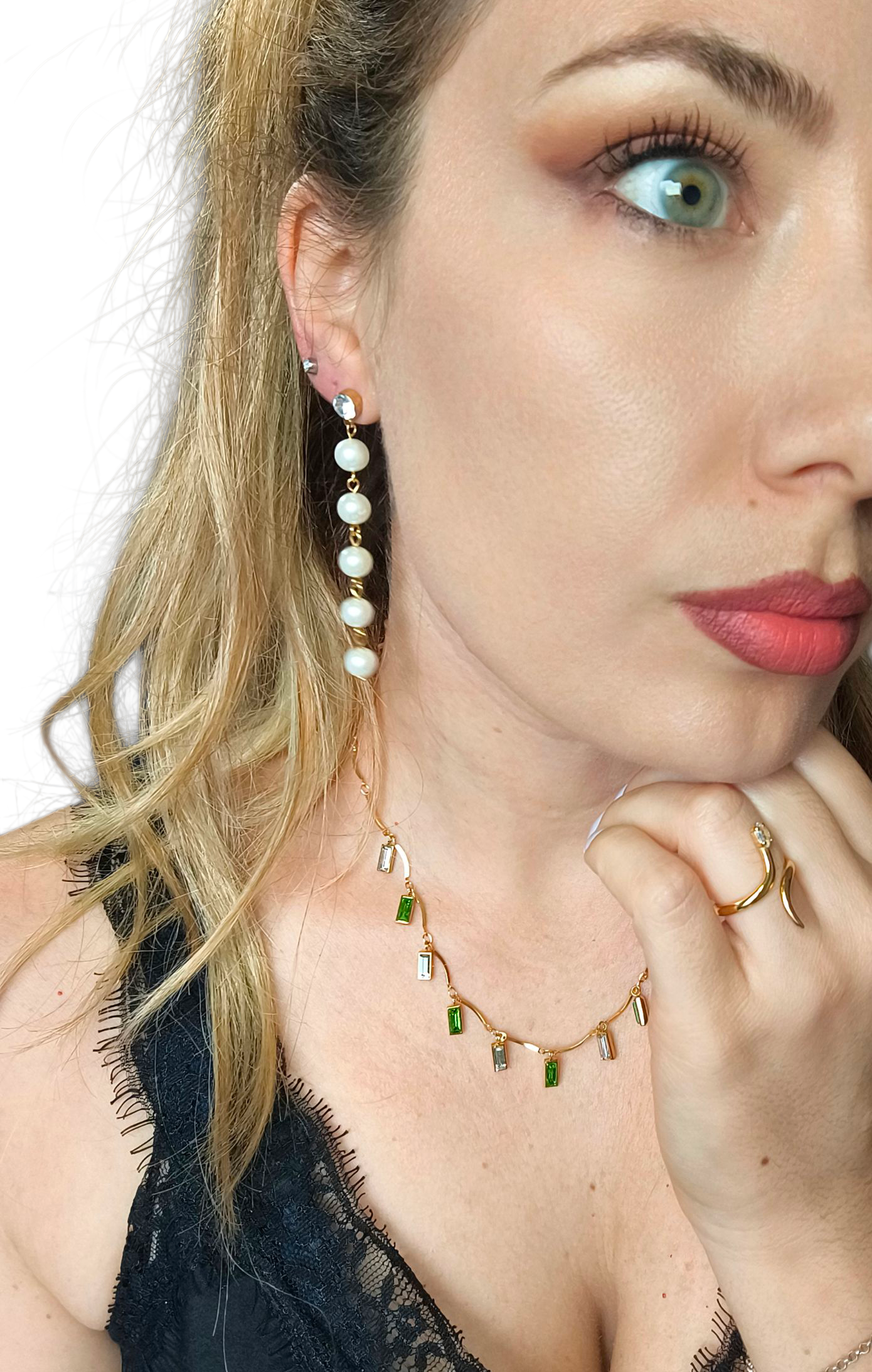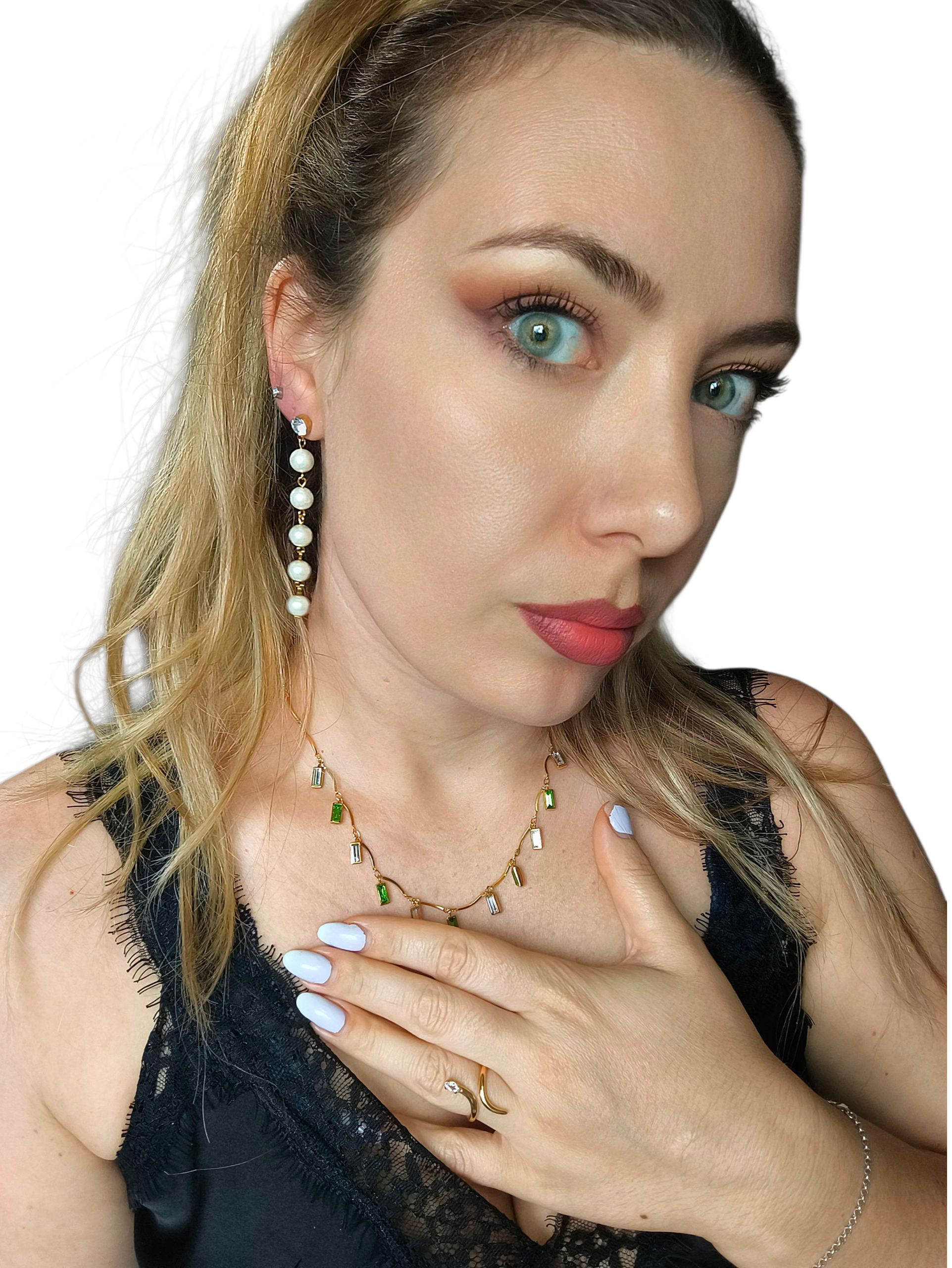 Questi orecchini unici combinano l’eleganza senza tempo delle perle con un tocco moderno, grazie a uno zircone al lobo che illumina il viso. La cascata di perle aggiunge un effetto sofisticato e affascinante, perfetto per chi cerca un gioiello distintivo e raffinato. Ideali per valorizzare ogni outfit con un’eleganza contemporanea.