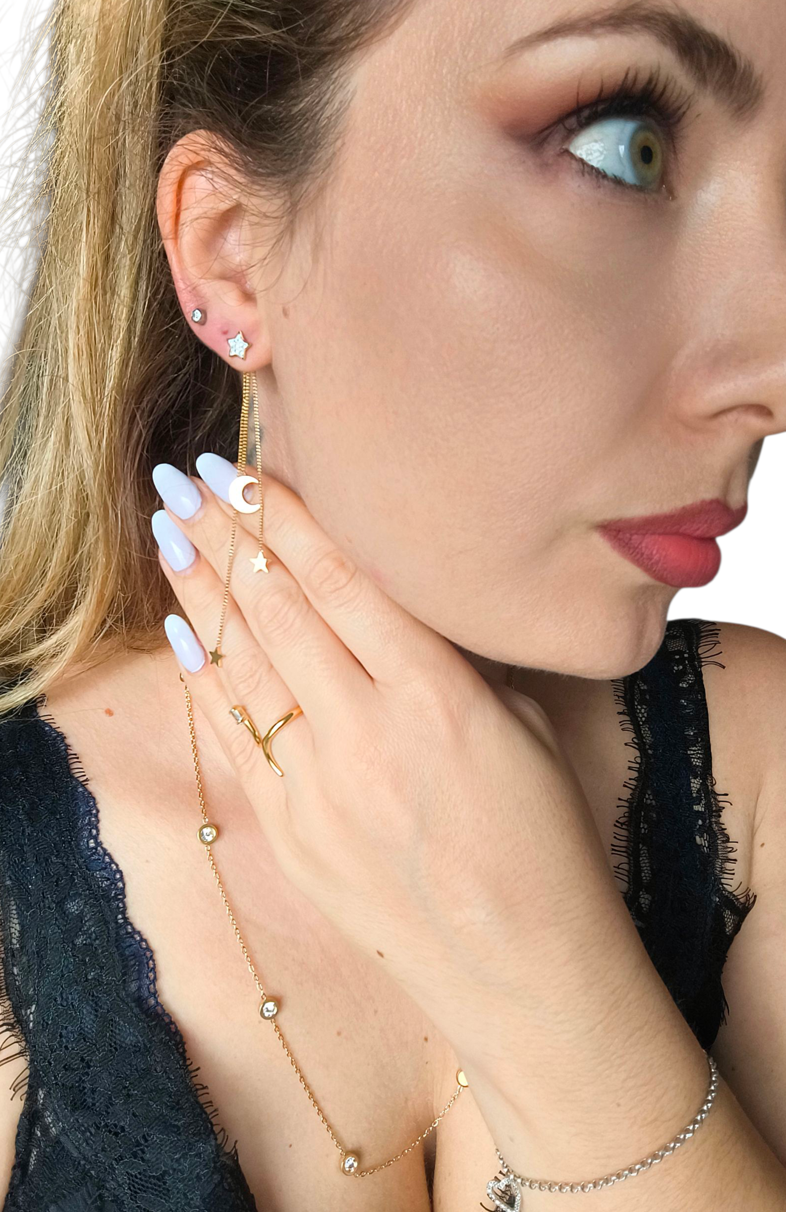 Questi orecchini a bottone "Galaxy" combinano una stella centrale impreziosita da brillantini con una cascata delicata di tre fili decorati da stelle e lune, creando un design unico e intrigante. Versatili e facilmente indossabili, offrono la possibilità di staccare la farfallina con i pendenti per abbinarla ad altri orecchini, aggiungendo personalizzazione al tuo stile con eleganza e raffinatezza.
