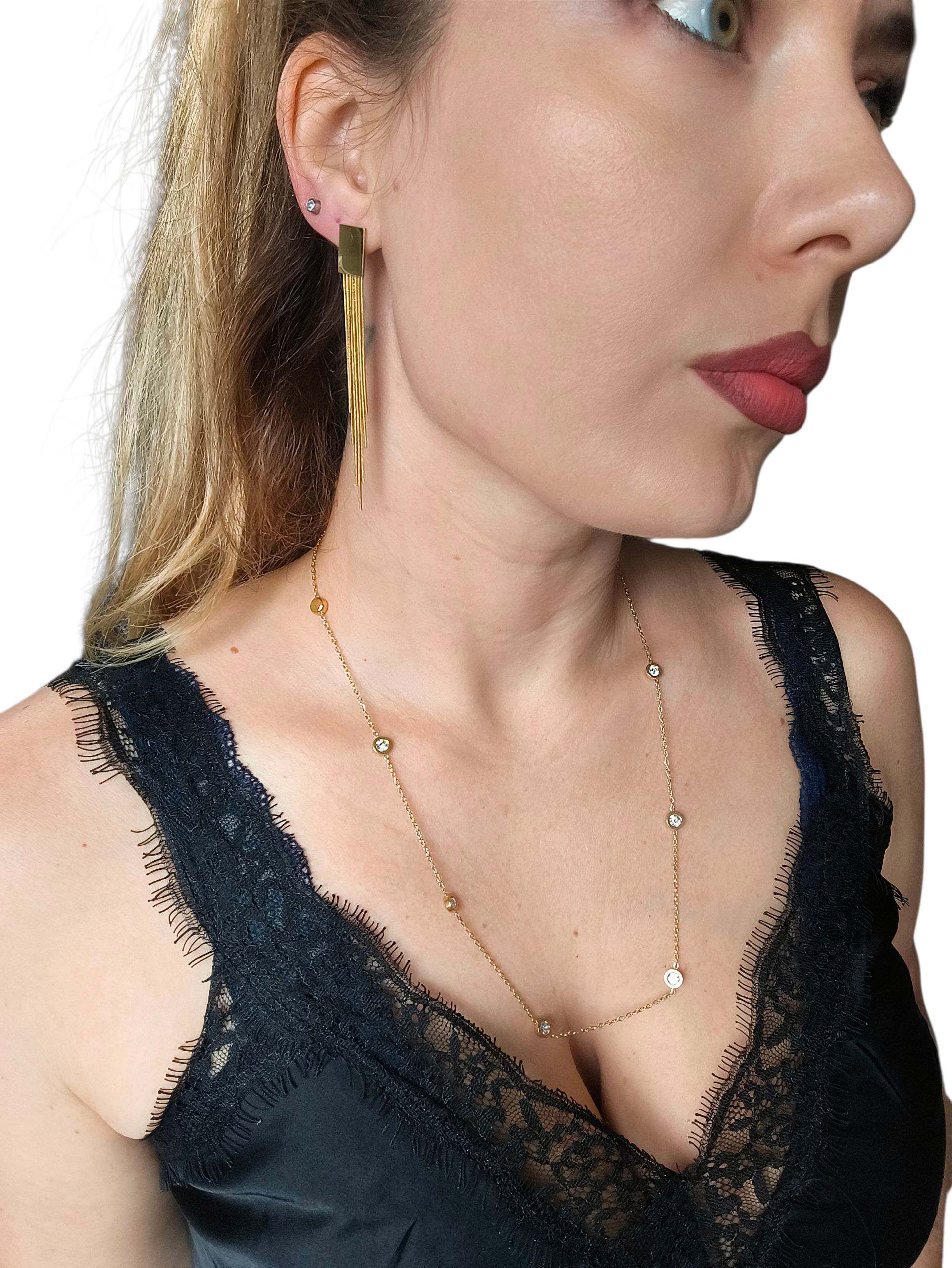 Questi orecchini con lingotto rettangolare al lobo uniscono design contemporaneo e raffinatezza, grazie ai fili a cascata che donano movimento e leggerezza. Pensati per chi cerca un accessorio elegante e sofisticato, aggiungono un tocco di charme discreto ma irresistibile a ogni outfit. Perfetti per valorizzare lo stile con un’eleganza senza tempo.