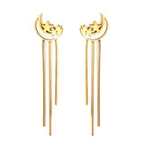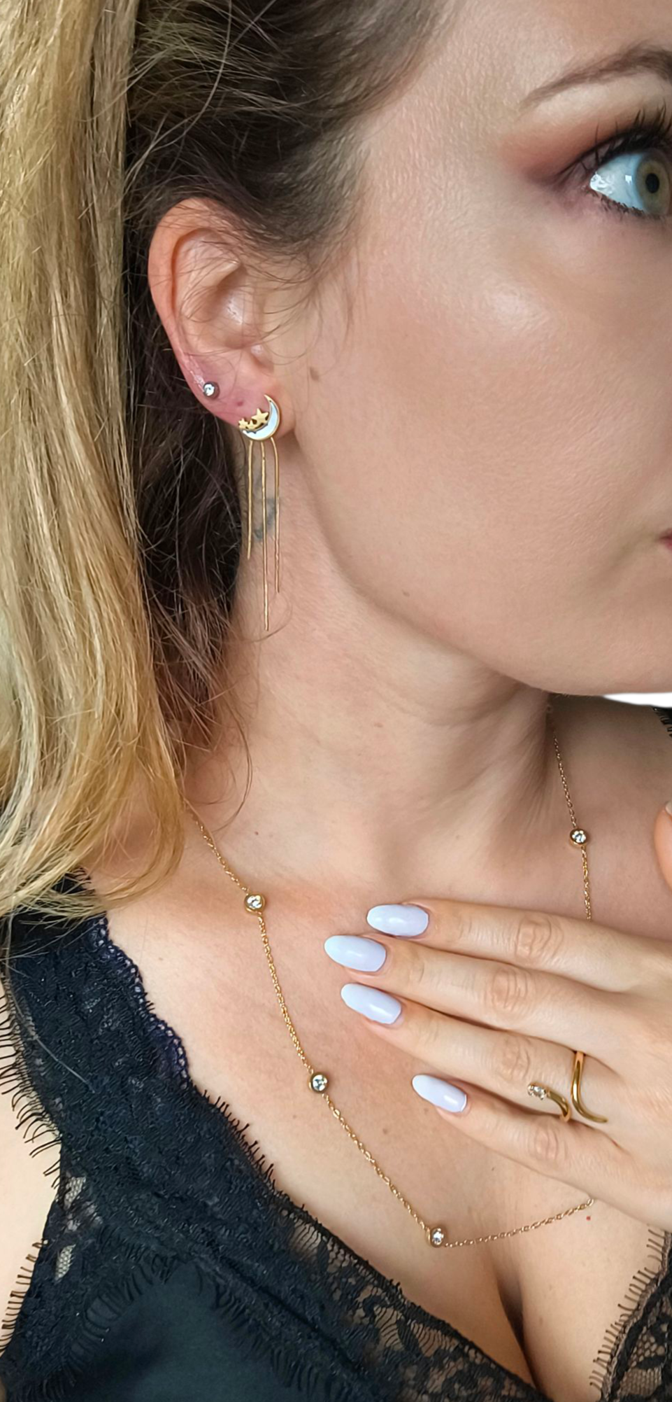 Questi orecchini Lunatica combinano una mezza luna e stelle con una cascata di fili sottili, creando un effetto etereo e surreale. Il design sofisticato aggiunge un tocco di magia e leggerezza, perfetto per chi cerca un accessorio elegante e originale capace di catturare lo sguardo con delicatezza.
